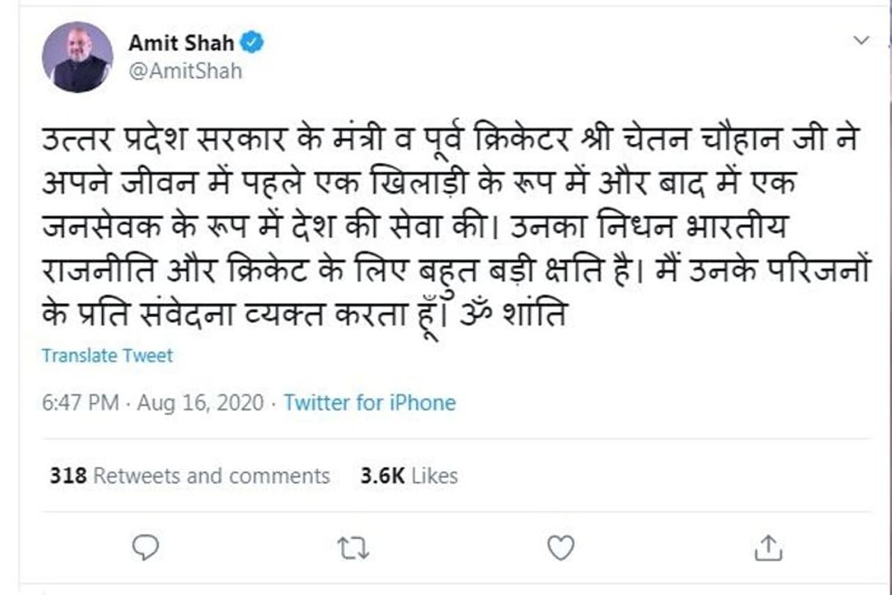 गृह मंत्री अमित शाह ने शोक जताते हुए कहा कि उत्तर प्रदेश सरकार के मंत्री व पूर्व क्रिकेटर चेतन चौहान ने अपने जीवन में पहले एक खिलाड़ी के रूप में और बाद में एक जनसेवक के रूप में देश की सेवा की। उनका निधन भारतीय राजनीति और क्रिकेट के लिए बहुत बड़ी क्षति है। मैं उनके परिजनों के प्रति संवेदना व्यक्त करता हूँ।