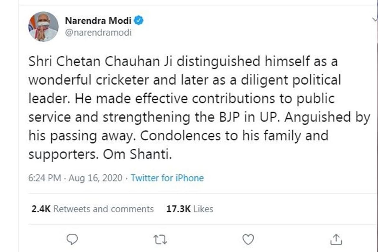 पीएम मोदी ने गहरा दुख व्यक्त किया है। पीएम ने अपने ट्टीट पर लिखा कि चेतन चौहान ने खुद को एक शानदार क्रिकेटर और बाद में एक मेहनती राजनीतिक नेता के रूप में प्रतिष्ठित किया। उन्होंने उत्तर प्रदेश में सार्वजनिक सेवा और भाजपा को मजबूत करने में प्रभावी योगदान दिया। उनके निधन से दुखी हूं। उनके परिवार और समर्थकों के प्रति गहरी संवेदना है।