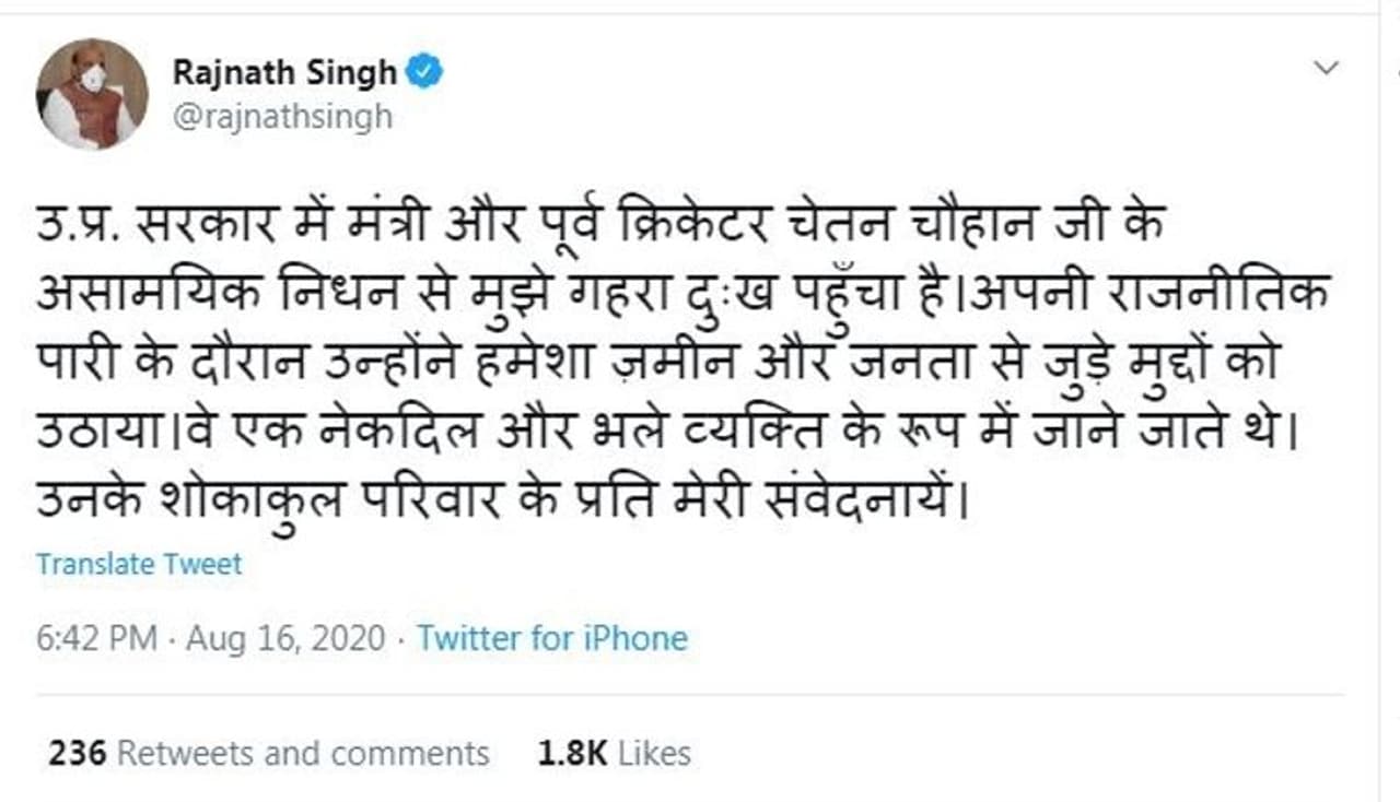 रक्षा मंत्री राजनाथ सिंह ने ट्वीट में लिखा उत्तर प्रदेश सरकार में मंत्री और पूर्व क्रिकेटर चेतन चौहान के असामयिक निधन से मुझे गहरा दुःख पहुँचा है। अपनी राजनीतिक पारी के दौरान उन्होंने हमेशा जमीन और जनता से जुड़े मुद्दों को उठाया। वे एक नेकदिल और भले व्यक्ति के रूप में जाने जाते थे। उनके शोकाकुल परिवार के प्रति मेरी संवेदनायें हैं।