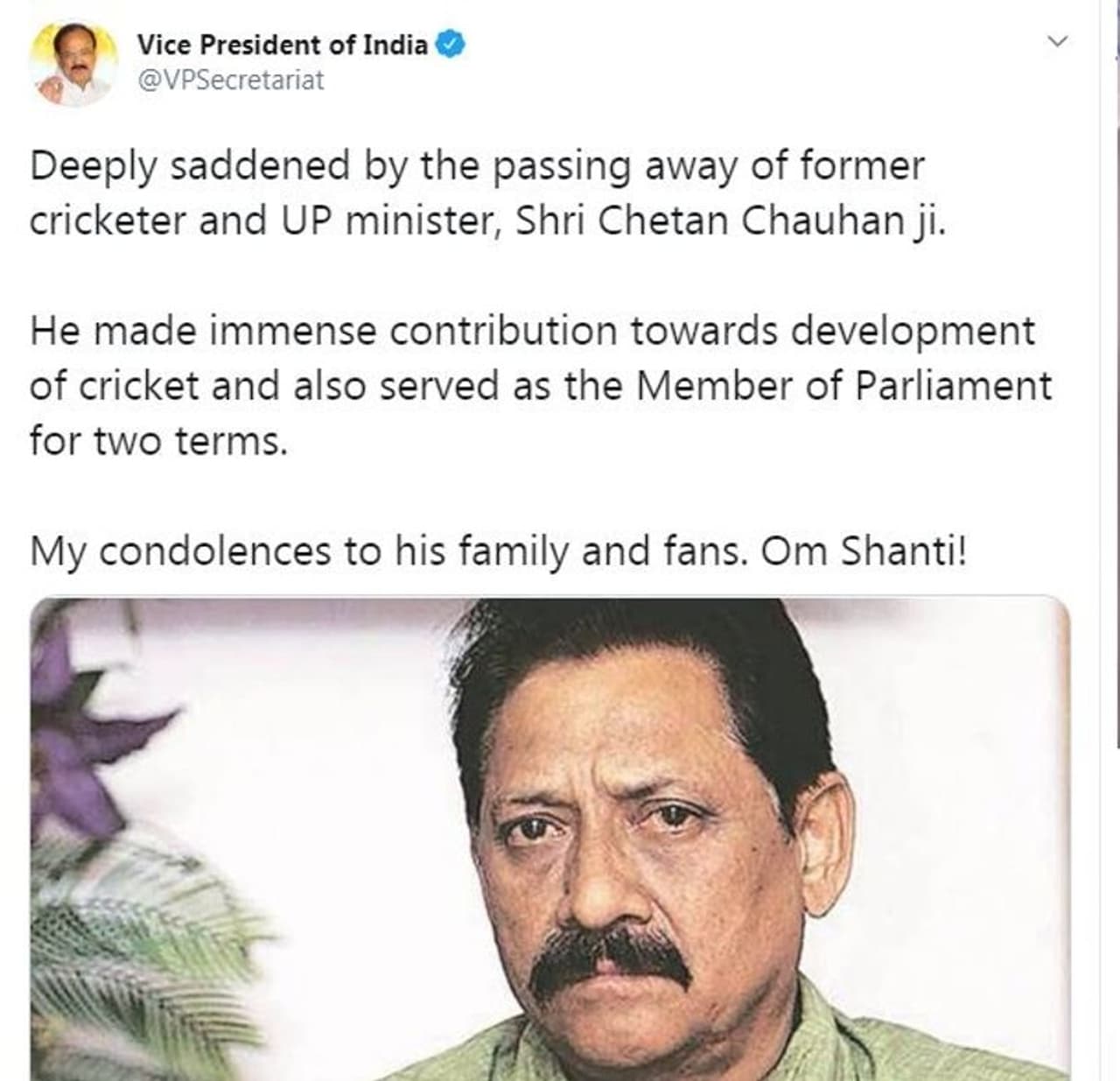 उप राष्ट्रपति वेंकैया नायडू ने ट्वीट में लिखा कि पूर्व क्रिकेटर और यूपी के मंत्री चेतन चौहान के निधन से गहरा दुख हुआ। उन्होंने भारतीय क्रिकेट में बहुत बड़ा योगदान दिया और दो बार संसद सदस्य के रूप में भी कार्य किया। उनके परिवार और प्रशंसकों के प्रति मेरी गहरी संवेदनाएं हैं।