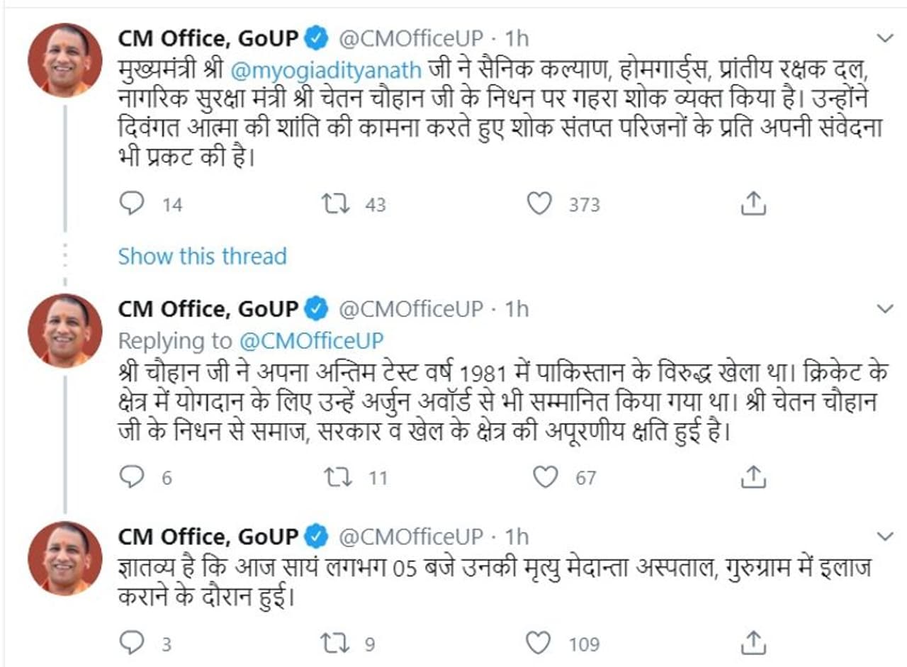 यूपी के सीएम योगी आदित्यनाथ ने चेतन चौहान को लेकर कई ट्टीट किए हैं। एक ट्टीट में सीएम ने कहा है कि पूर्व अंतरराष्ट्रीय खिलाड़ी, मंत्रिमंडल में मेरे सहयोगी चेतन चौहान के असामयिक निधन का व्यथित कर देने वाला समाचार प्राप्त हुआ। प्रभु श्री राम उनके परिजनों को इस अपार दुख को सहने की शक्ति एवं दिवंगत आत्मा को अपने श्री चरणों में स्थान प्रदान करें। वहीं, सीएम ने शाम सात बजे से आपात मीटिंग अपने सरकारी आवास 5 केडी पर आकस्मिक कैबिनेट बैठक बुलाई है।