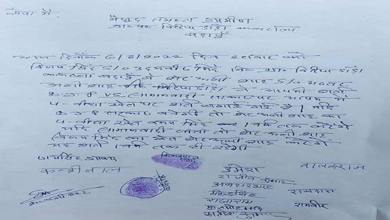 चुनावी बहस की शर्त को स्वीकारने के लिये गांव में प्रमुख ग्रामीणों को बुलाकर पंचायत लगाई गई और भरी पंचायत में स्वीकार किया की भाजपा की सरकार बनी तो शेर अली शाह चार बीघा जमीन विजय सिंह को सालभर तक फसल करने को देंगे। अगर सपा की सरकार बनी तो विजय सिंह चार बीघा जमीन शेर अली शाह को सालभर के लिये फसल करने के लिये देंगे। इस बात से मुकर न जायें इसके लिये गांव के प्रमुख लोग किशनपाल सेंगर, जय सिंह शाक्य, कन्ही लाल, राजाराम, उमेश, राजीव कुमार, सतीश कुमार सहित 12 गवाह ने पत्र तैयार कराया और उस पर अपनी गवाही दी है। भरी पंचायत में पत्र लिखा गया और फैसला हुआ इसके बाद यह पत्र जनपद में वायरल हुआ है। देखिए उस वायरल पत्र को जिसमें दोनों ग्रामीणों की लिखा-पढ़ी हुई है।