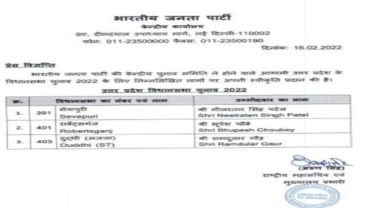 उत्तर प्रदेश विधानसभा चुनाव को लेकर भाजपा ने 3 प्रत्याशियों की एक और लिस्ट जारी कर दी है। जारी की गई इस लिस्ट में सेवापुरी, राबर्ट्सगंज और दुद्धी से उम्मीदवारों का ऐलान किया गया है। इस बीच बुधवार को सीएम योगी आदित्यनाथ ने वाराणसी पहुंचकर संत रविदास मंदिर में माथा भी टेका।