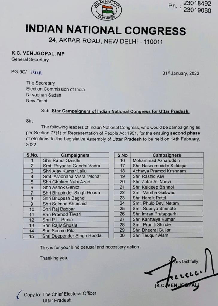 कांग्रेस ने जिन 30 स्टार प्रचारकों की लिस्ट जारी की है उसमें सांसद राहुल गांधी, महासचिव व उत्तर प्रदेश प्रभारी प्रियंका गांधी, प्रदेश अध्यक्ष अजय लल्लू, आराधना मिश्र मोना, गुलाम नबी आजाद, अशोक गहलोत, भूपेंद्र सिंह हुड्डा, भूपेश बघेल, सलमान खुर्शीद, राज बब्बर, प्रमोद तिवारी, पीएल पुनिया, राजीव शुक्ला, सचिन पायलट, दीपेंद्र सिंह हुड्डा को जगह मिली है। नसीमुद्दीन सिद्दीकी, आचार्य प्रमोद कृष्णम, जफर अली नकवी, कुलदीप बिश्नोई, वर्षा गायकवाड़, हार्दिक पटेल भी इस लिस्ट में शामिल हैं।