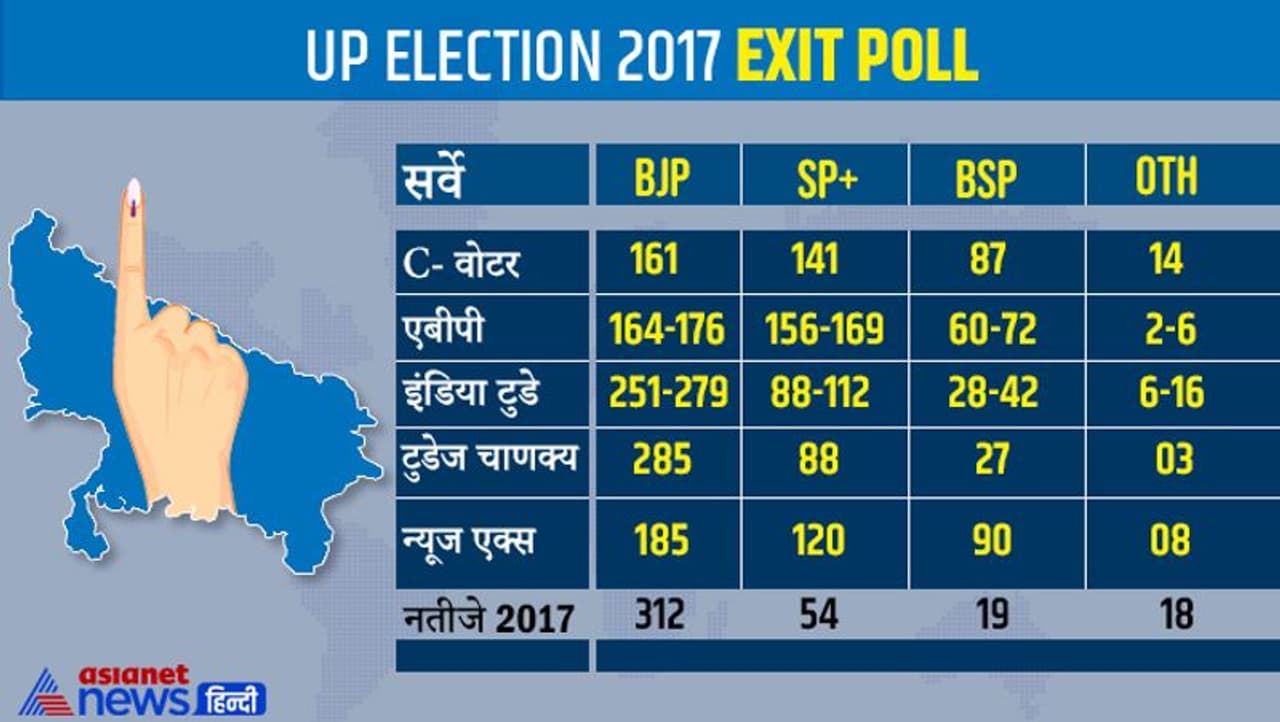 2017 में जब यूपी में चुनाव हुए थे, तब एग्जिट पोल क्या बता रहे थे और नतीजे क्या रहे थे, डालते हैं उस पर एक नजर। बता दें कि 2017 के एग्जिट पोल में सबसे सटीक अनुमान टुडेज चाणक्य का था। टुडेज चाणक्य ने बीजेपी को 285 सीटें मिलने का दावा किया था और नतीजे आने के बाद बीजेपी को 312 सीटें मिली थीं, जोकि दूसरे एग्जिट पोल की तुलना में सबसे सटीक थी।