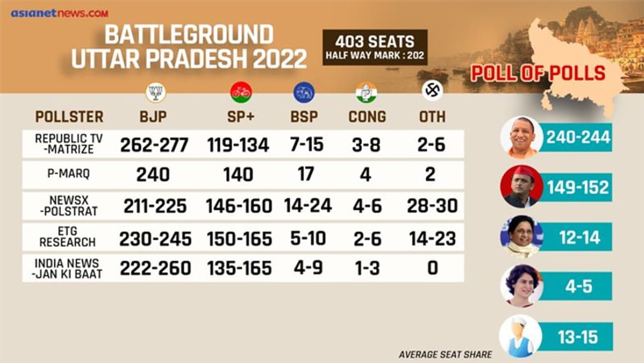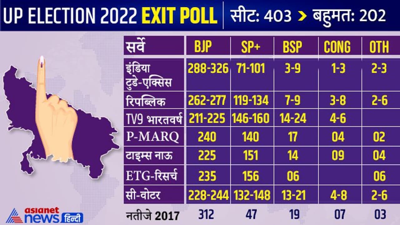 उत्तर प्रदेश (UP Assembly Election 2022) में सोमवार यानी 7 मार्च को आखिरी चरण का मतदान पूरा हो चुका है। इसी के साथ ही पांचों राज्यों यूपी, उत्तराखंड, पंजाब, गोवा और मणिपुर में वोटिंग प्रक्रिया भी खत्म हो चुकी है। इसी बीच अब तक हुए 7 एग्जिट पोल के मुताबिक, यूपी में एक बार फिर बीजेपी सरकार बनती दिख रही है।