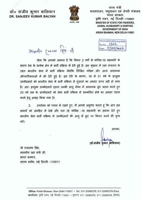 केंद्रीय राज्यमंत्री संजीव बालियान ने रक्षामंत्री राजनाथ सिंह को एक पत्र लिखा है। इस पत्र में उन्होंने सेना भर्ती को लेकर कुछ बिन्दु रखें है। इस पत्र के सामने आने के बाद युवाओं में नई उम्मीद जगी है। कोविड के मद्देनजर आयु सीमा पार कर चुके युवाओं को छूट देने की मांग भी इस पत्र के जरिए रखी गई है।