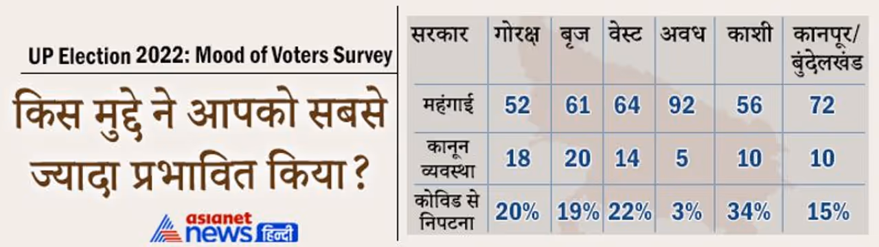 काशी क्षेत्र: सर्वे में 56% ने कहा कि महंगाई के मुद्दे ने सबसे अधिक प्रभाव डाला जबकि 34% बोले कोविड हैंडलिंग ने सबसे अधिक प्रभावित किया। दस प्रतिशत बोले कि कानून के राज का मुद्दा उनको सबसे अधिक प्रभावित किया।