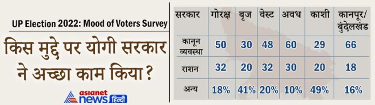 पश्चिम क्षेत्र: सर्वे में 48 प्रतिशत लोगों ने कहा कि कानून का राज स्थापित करने में योगी सरकार ने बेहतर काम किया। 32 प्रतिशत लोगों ने कहा कि राशन के मुद्दे पर योगी सरकार बेहतर काम किया। जबकि 20 प्रतिशत ने बिजली, सड़क और हिंदुत्व के मुद्दे पर योगी सरकार को बेहतर बताया।
