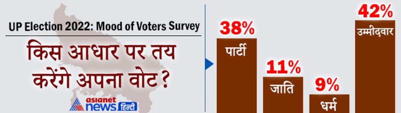 यूपी के बारे में माना जाता है कि यहां के वोटर अपनी जाति वाले कैंडिडेट को ही पहली पसंद मानता है। लेकिन इस बार वह जाति-धर्म को इग्नोर कर सकता है। यूपी के लोग अपना वोट किस आधार पर देंगे? इस सवाल पर 42% लोगों ने कहा- कैंडिडेट देखकर ही वह वोट करेंगे। 38 प्रतिशत का कहना है- वो पार्टी के आधार पर अपना वोट देंगे। जबकि 11% लोग जाति और 9% धर्म के आधार पर वोट करेंगे।