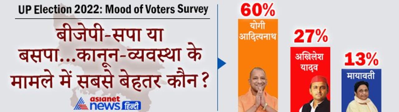 यूपी में कानून-व्यवस्था सबसे बड़ा मुद्दा हाल के दशकों में रहा है। इस बार भी कानून-व्यवस्था चुनाव में प्रमुख आधार साबित होगा। लॉ एंड आर्डर के मामले में प्रदेश की जनता की पहली पसंद योगी आदित्यनाथ सरकार है। सर्वे में 60% लोगों ने माना- योगी सरकार सबसे बेस्ट है। 27% ने माना- अखिलेश यादव की सरकार कानून-व्यवस्था के मामले में बेस्ट थी। जबकि 13% लोगों ने मायावती सरकार को बेहतर बताया।