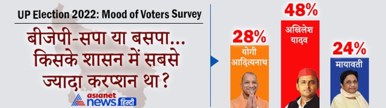 यूपी के लोगों का मानना है कि राज्य में करप्शन एक प्रमुख मुद्दा है। सर्वे में शामिल 48% लोगों का मानना है कि अखिलेश यादव के नेतृत्व वाली समाजवादी पार्टी की सरकार में सबसे ज्यादा था। जबकि 28% लोगों ने कहा- योगी आदित्यनाथ की बीजेपी सरकार में भी भ्रष्टाचार है। वहीं, 24% का मानना है कि मायावती की सरकार में बाकियों से कम करप्शन था।