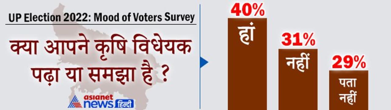 पूरे देश में कृषि कानूनों को लेकर बहस हो रही है। लेकिन यूपी में अभी भी इस कानून को लेकर एक राय नहीं बनती दिख रही। पश्चिमी यूपी को छोड़ दें तो पूर्वांचल व अन्य क्षेत्र अभी भी इस कानून को लेकर मिलाजुला राय रखता है। 55% लोगों ने साफ कह दिया कि वह नहीं जानते कि यह कानून अच्छा है या बुरा है। 24% की राय है कि यह कानून बेहतर है, जबकि 21% ने इसे खराब बताया। हालांकि, 40% लोगों ने कहा कि वह कृषि कानूनों को पढ़े हैं और समझते भी हैं, जबकि 31% तो इस कानून के बारे में अनजान हैं।