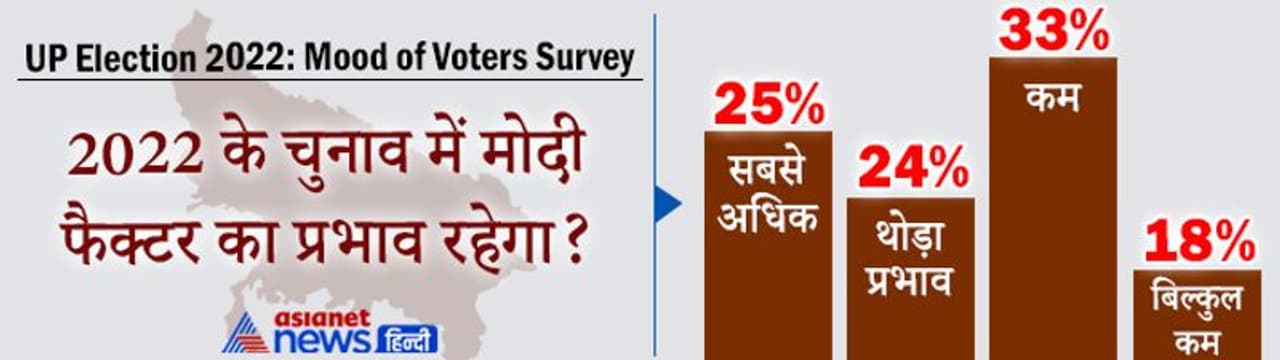 गुजरात के मुख्यमंत्री नरेंद्र मोदी को जनता ने प्रचंड बहुमत के साथ 2014 में देश का प्रधानमंत्री बनाया। मोदी दुबारा एकतरफा जनादेश के साथ देश के पीएम बने। 2014 के बाद देश में जिन राज्यों में भी चुनाव हुए उसमें मोदी फैक्टर का बीजेपी की जीत में सबसे बड़ा योगदान रहा है। 2017 के यूपी विधानसभा चुनाव में भी हर सीट पर मोदी फैक्टर ही कामयाबी का मूल मंत्र रहा। क्या इस बार विधानसभा चुनाव में मोदी फैक्टर काम करेगा? इस सवाल पर 33% लोगों ने माना- इस बार के चुनाव में मोदी फैक्टर कम प्रभाव डालेगा। जबकि 25% का मानना है कि मोदी फैक्टर प्रभावी रहेगा। 24% ने कहा- मोदी फैक्टर का बहुत थोड़ा प्रभाव रहेगा।