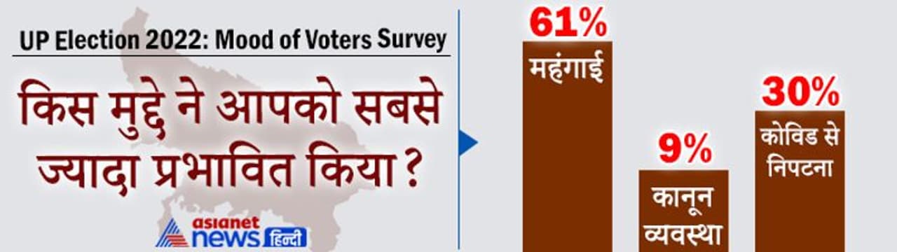 यूपी के लोग कानून के राज से खुश तो महंगाई की वजह से बिगड़े बजट ने परेशान कर रखा है। सर्वे में शामिल लोगों से सवाल किया गया कि उनको कौन सा मुद्दा सबसे अधिक प्रभावित किया? अधिकतर का जवाब था महंगाई। 61% का मानना है कि महंगाई ने उनके जीवन को बेपटरी कर दिया। वहीं, 30% लोगों का कहना है कि कोविड के खराब सिस्टम से वह प्रभावित हैं।