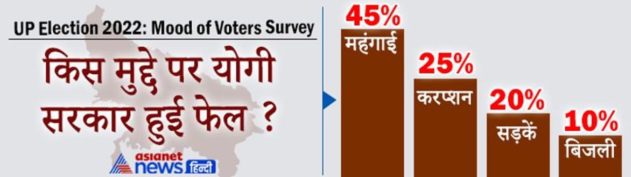 सर्वे में शामिल लोगों ने महंगाई के मोर्चे पर योगी सरकार को फेल बताया है। 45% लोगों का मानना है कि बीजेपी सरकार महंगाई कम करने में असफल साबित हुई। 25% ने कहा- सरकार करप्शन के मुद्दे पर लड़खड़ाई गई। सड़कों के मुद्दे पर 20% लोगों ने कहा- यह काम सरकार ठीक से नहीं कर पाई। जबकि 10% लोग बिजली आपूर्ति के मामले में योगी सरकार को फेल बताया।