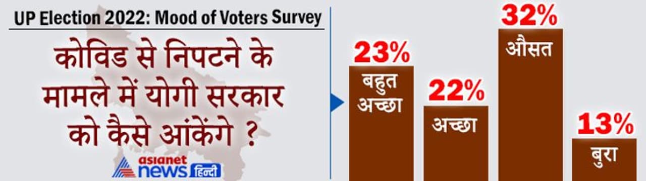 वैश्विक महामारी कोविड-19 से पूरी दुनिया परेशान रही। यूपी में भी एक समय हालात बेहद बिगड़ गए थे लेकिन यूपी सरकार प्रभावी स्ट्रैटेजी से इसको नियंत्रित करने में कामयाब रही। आलम यह कि कई देशों ने यूपी मॉडल की सराहना की। आने वाले चुनाव में जनता कोविड नियंत्रण को लेकर सरकार के बारे में क्या सोचती है? सर्वे में लोगों से पूछा गया कि योगी सरकार कोविड नियंत्रण के लिए क्या सही कदम उठा पाई? 32% लोगों ने योगी सरकार के प्रयास को औसत बताया, जबकि 23% ने डिस्टिंक्शन मार्क्स से योगी सरकार को पास कर दिया। जबकि 13% का मानना है कि मौजूदा सरकार ने खराब काम किया।