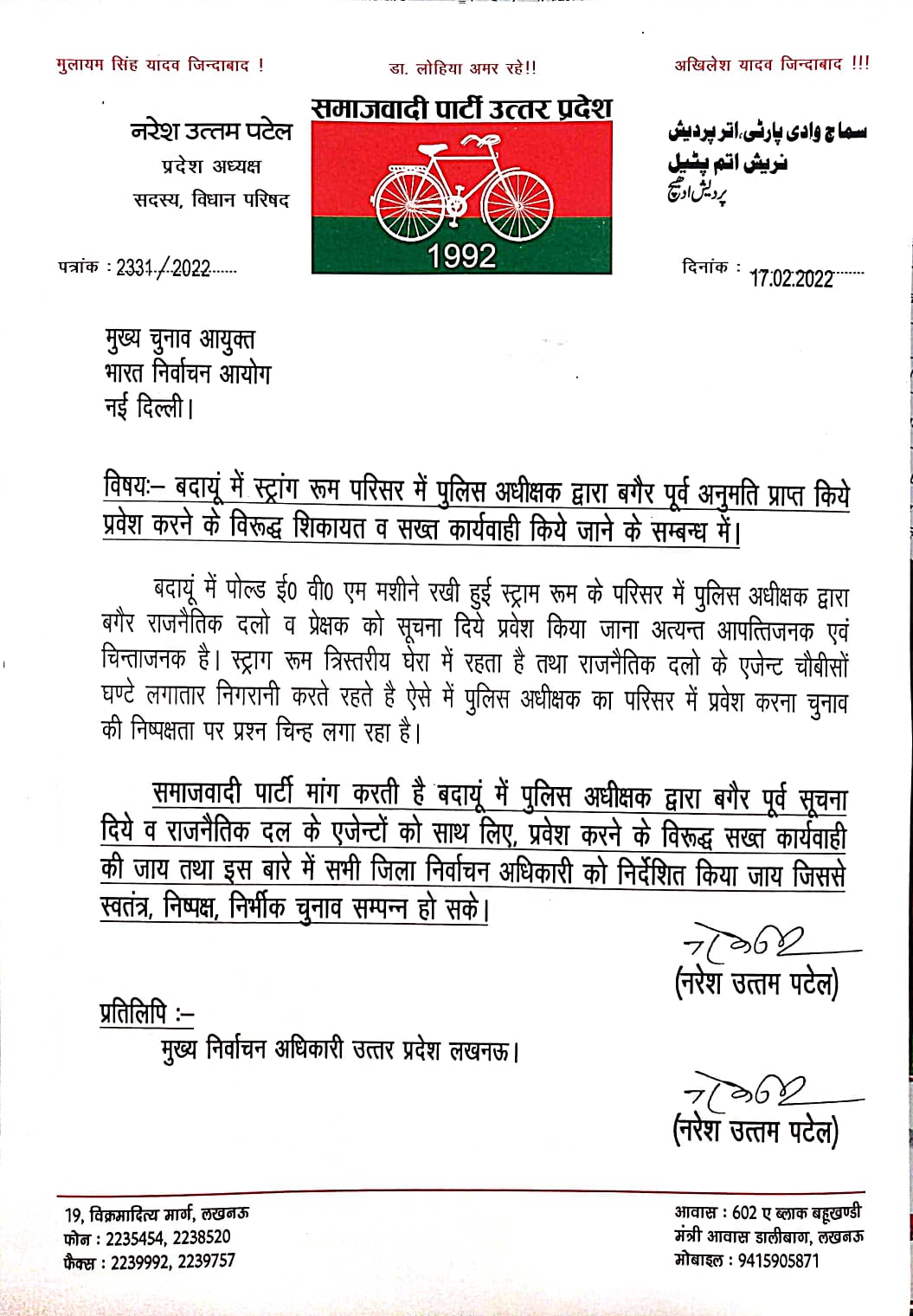 सपा आगे मांग करती है कि बदायूं में पुलिस अधीक्षक द्वारा बगैर पूर्व सूचना दिये व राजनैतिक दल के एजेन्टों को साथ लिए, प्रवेश करने के विरूद्ध सख्त कार्यवाही की जाए तथा इस बारे में सभी जिला निर्वाचन अधिकारी को निर्देशित किया जाए जिससे स्वतंत्र, निष्पक्ष, निर्भीक चुनाव सम्पन्न हो सके।