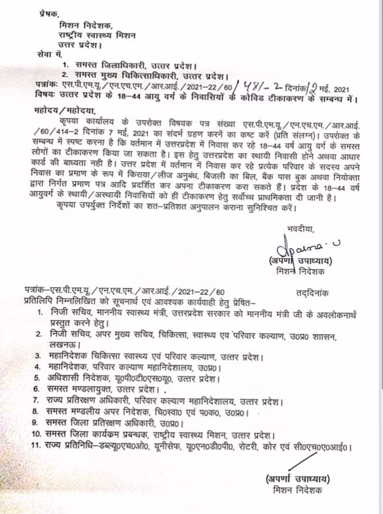 लखनऊ (Uttar Pradesh) । यूपी में कोरोना का टीका लगवाने के लिए आधार कार्ड का होना आवश्यक नहीं है। यानि यूपी में स्थाई और अस्थाई रूप से निवास करने वाले 18 से अधिक उम्र के लोगों का भी टीकाकरण किया जाएगा। बता दें कि, राज्य सरकार ने पहले यूपी के आधार कार्ड वालों को ही वैक्सीनेशन की इजाजत दी थी। लेकिन, अब यूपी में निवास करने का कोई भी दस्तावेज देना होगा।