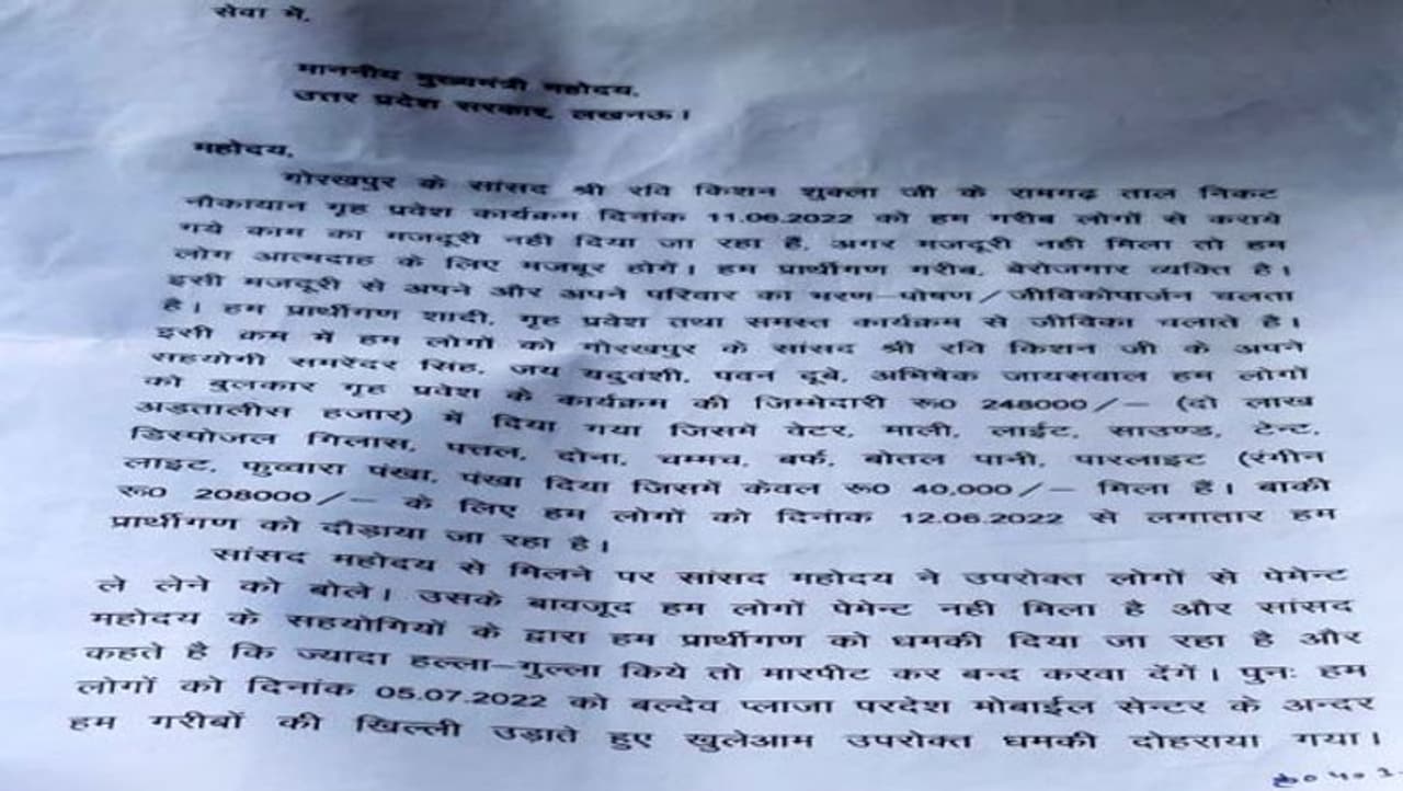 मजदूरों ने प्रार्थना पत्र देकर बताया कि रवि किशन के गोरखपुर वाले घर में गृह प्रवेश का कार्यक्रम था। वहां पर हम सबने काम किया। लेकिन, हमारी मजदूरी नहीं दी गई। अगर पैसे नहीं मिले तो मजबूरन आत्मदाह कर लेंगे।