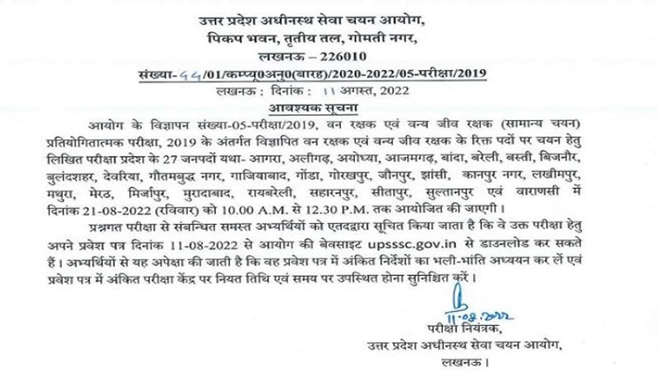 यूपीएसएसएससी ने अधिसूचना जारी कर कहा कि विज्ञापन संख्या-05 परीक्षा/ 2019 वन रक्षक एक वन्य जीव रक्षक प्रतियोगितात्मक परीक्षा, 2019 के अंतर्गत विज्ञापित रिक्त पदों पर चयन हेतु दिनांक रविवार 21 अगस्त 2022 को सुबह 10 बजे से 12.30 बजे तक आयोजित की जाएगी। प्रश्नगत परीक्षा से संबंधित समस्त अभ्यर्थियों को एतदद्वारा सूचित किया जाता है कि वे उक्त परीक्षा हेतु अपने प्रवेश पत्र दिनांक 11 अगस्त 2022 से आयोग की ऑफिशियल वेबसाइट upsssc.gov.in से डाउनलोड कर सकते है। आगे लिखा है कि अभ्यर्थियों से यह अपेक्षा की जाती है कि वह प्रवेश पत्र में अंकित निर्देशों का भली-भांति अध्ययन कर लें और प्रवेश पत्र में अंकित परीक्षा केंद्र पर नियत तिथि एवं समय पर उपस्थित होने सुनिश्चित कर लें।