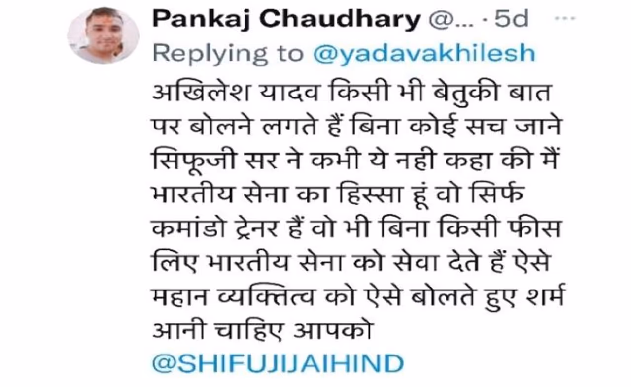 पकंज चौधरी नाम के एक यूजर ने शिफूजी के समर्थन में ट्वीट करते हुए लिखा, अखिलेश यादव किसी भी बेतुकी बात पर बोलने लगते हैं, बिना कोई सच जाने। शिफूजी सर ने कभी ये नहीं कहा कि मैं भारतीय सेना का हिस्सा हूं। वो सिर्फ कमांडो ट्रेनर हैं। वो भी बिना किसी फीस लिए भारतीय सेना को सेवा देते हैं। ऐसे महान व्यक्तित्व को ऐसे बोलते हुए शर्म आनी चाहिए आपको। इसमें शिफूजी को टैग भी किया गया है।