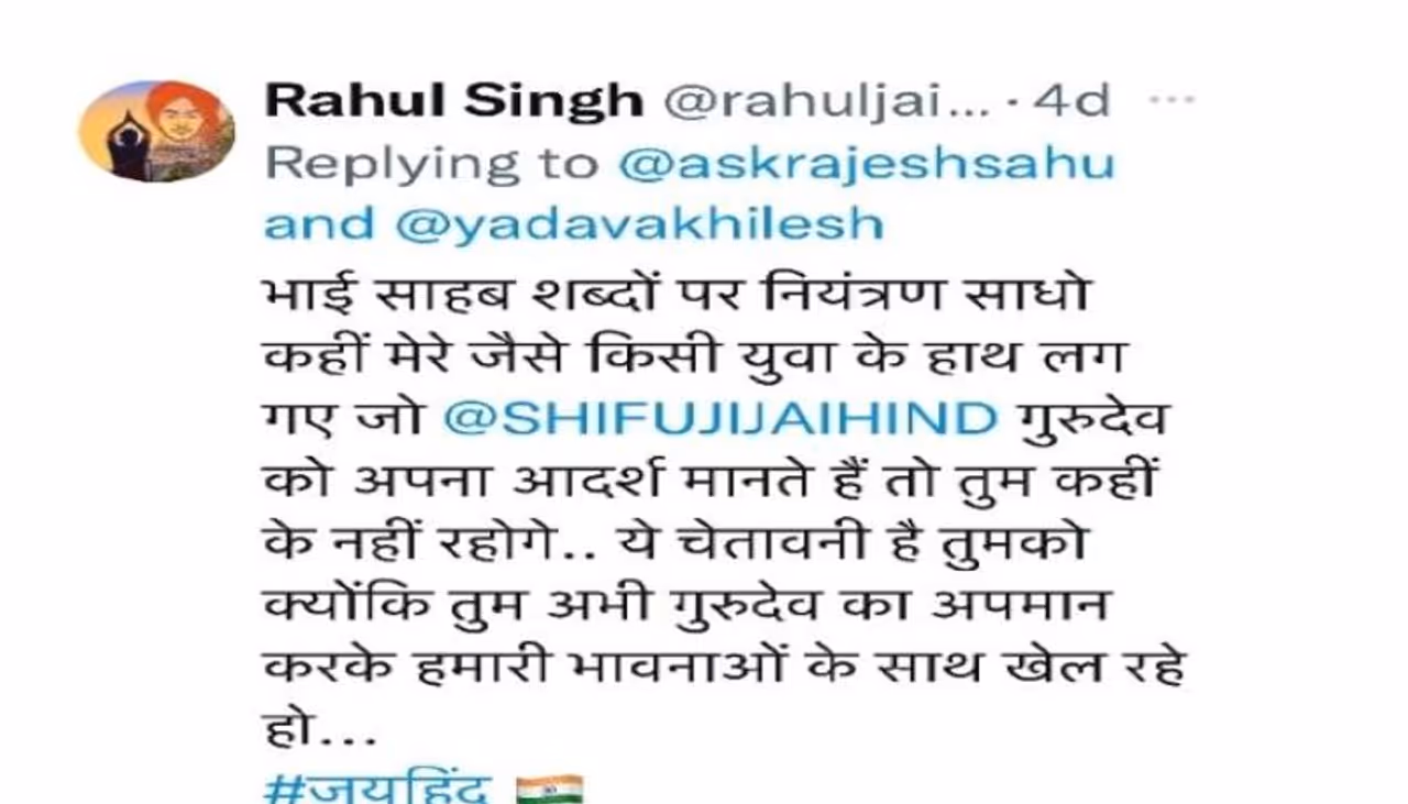 वहीं, राहुल सिंह नाम के ट्वीट अकाउंट से लिखा गया, भाई साहब शब्दों पर नियंत्रण साधो। कहीं मेरे जैसे किसी युवा के हाथ लग गए जो शिफूजी गुरुदेव को अपना आर्दश मानते हैं तो तुम कहीं के नहीं रहोगे... ये चेतावनी है तुमको क्योंकि तुम अभी गुरुदेव का अपमान करके हमारी भावनाओं के साथ खेल रहे हो... अंत में हैश टैग के साथ जयहिंद लिखा है।