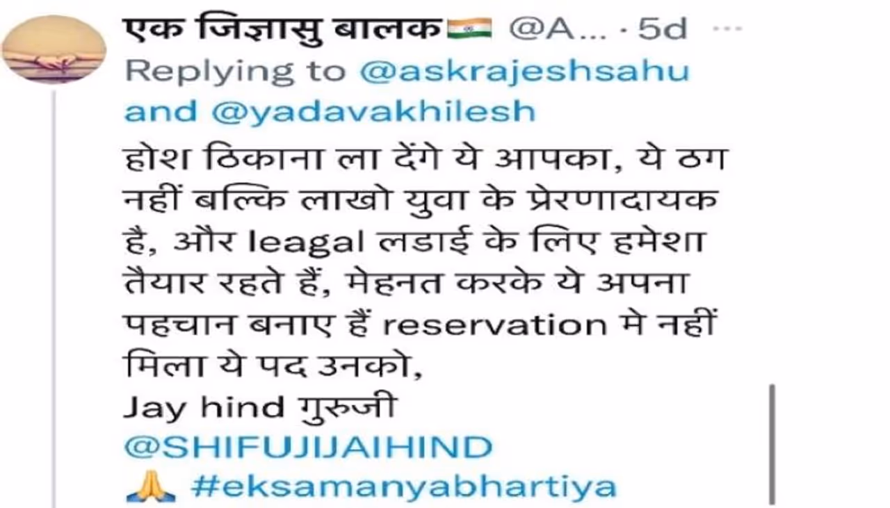 एक यूजर ने लिखा, होश ठिकाना ला देंगे ये आपका, ये ठग नहीं बल्कि, लाखों युवा के प्रेरणादायक है, और लीगल लड़ाई के लिए हमेशा तैयार रहते हैं। मेहनत करके ये अपना पहचान बनाए हैं। रिजर्वेशन में नहीं मिला ये पद उनको। जय हिंद गुरुजी। इसके साथ ही यह ट्वीट शिफूजी को टैग भी किया गया है।