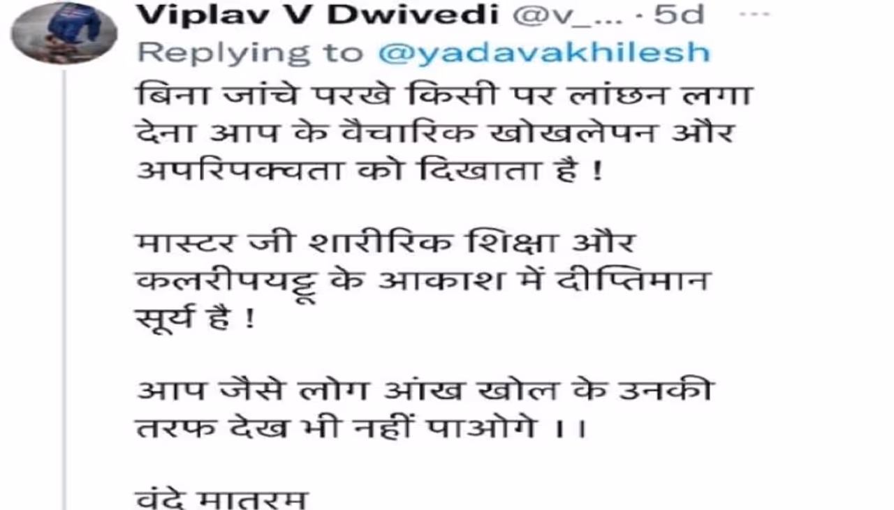 विपुल वी द्विवेदी नाम के यूजर ने कहा, बिना जांचे परखे किसी पर लांछन लगा देना आपके वैचारिक खोखलेपन और अपरिपक्वता को दिखाता है। मास्टर जी शारीरिक शिक्षा और कलरीपयटू के आकाश में दीप्तिमान सूर्य हैं! आप जैसे लोग आंख खोल के उनकी तरफ देख भी नहीं पाओगे। वंदे मातरम।