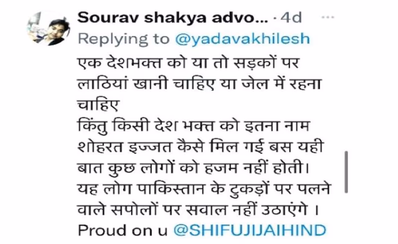 बताया जा रहा है कि इन तथ्यों के बारे में जांच-पड़ताल किए बिना ही अखिलेश यादव ने ट्वीट कर दिया। मास्टर शिफूजी के खिलाफ इस पोस्ट पर जब आप कमेंट्स पढ़ेंगे तो समझ आएगा कि अखिलेश यादव आज तक की पूरी राजनैतिक जीवन यात्रा में सबसे बुरी तरह से ट्रोल हो रहे हैं। लाखों देशभक्त हिंदू-मुस्लिम-सिख ईसाई युवाओं ने देश-विदेश से ग्रांडमास्टर शिफूजी के समर्थन में तथ्यों के साथ मोर्चा खोल दिया है। ये सभी युवा मास्टर शिफूजी महाराज को अपना आदर्श, गुरु और एक सच्चा बेबाक दलेर राष्ट्रभक्त मानते हैं।