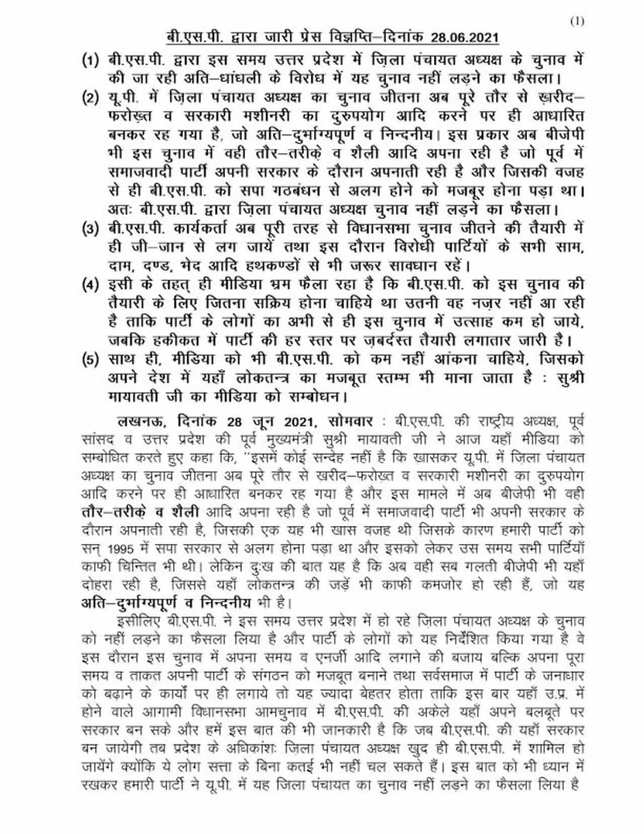 मायावती ने पत्रकारों से बातचीत के दौरान घोषणा करते हुए कहा कि इस बार के जिला पंचायत के चुनावों में बीसपी अपना वक्त बर्बाद नहीं करेगी। क्योंकि जिस तरह की धांधली चल रही है उसे देखकर यह निर्णय लेना पड़ा है। अगर यह चुनाव पारदर्शी होते तो हम जरूर लड़ते।