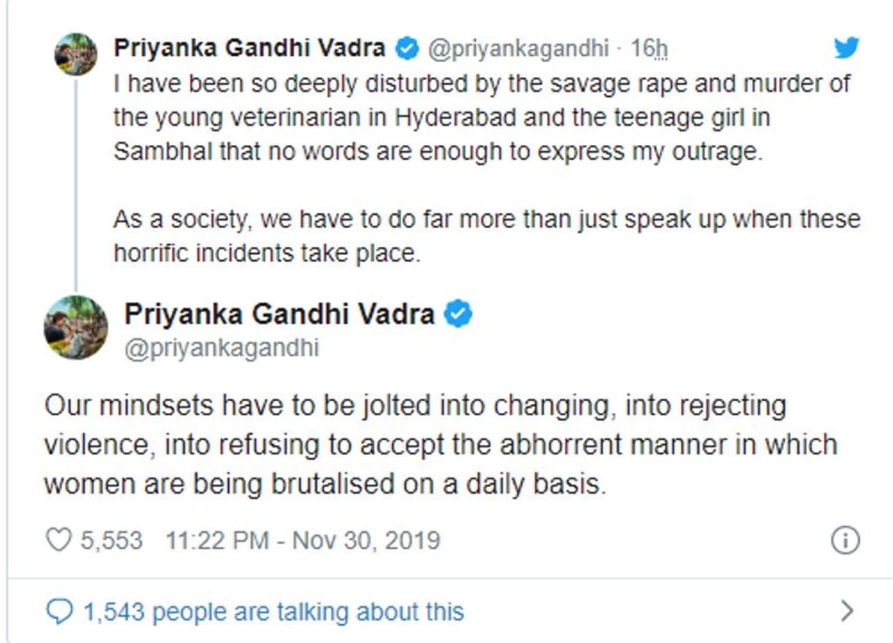 आपको बता दें कि इस मामले पर कांग्रेस महासिचव प्रियंका गांधी वाड्रा ने भी नाराजगी जताई है उन्होंने ट्वीट किया- हैदराबाद और संभल में रेप और हत्या की घटनाओं से बहुत दुखी हूं। अपना गुस्सा बयां करने के लिए मेरे पास कोई शब्द नहीं है।
