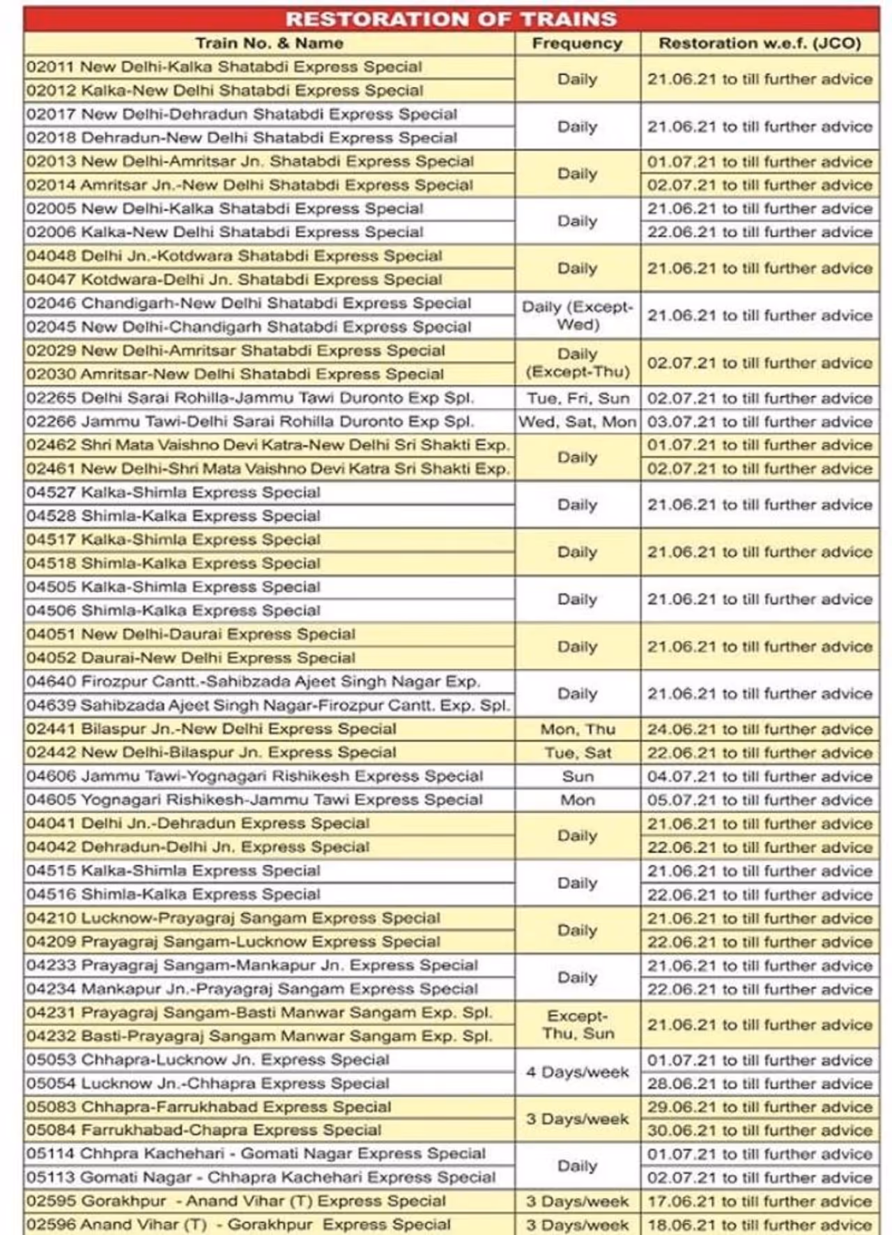रेलवे विभाग ने जो लिस्ट जारी की है उसमें नई दिल्ली-कालका शताब्दी, नई दिल्ली-देहरादून शताब्दी, नई दिल्ली-अमृतसर शताब्दी, दिल्ली सराय रोहिल्ला-जम्मू तवी दुरंतो, माता वैष्णो देवी कटरा-नई दिल्ली श्री शक्ति एक्सप्रेस, लखनऊ-प्रयागराज संगम एक्सप्रेस जैसी कई अन्य ट्रेनें शामिल हैं। जो अब रोजाना चलेंगी।