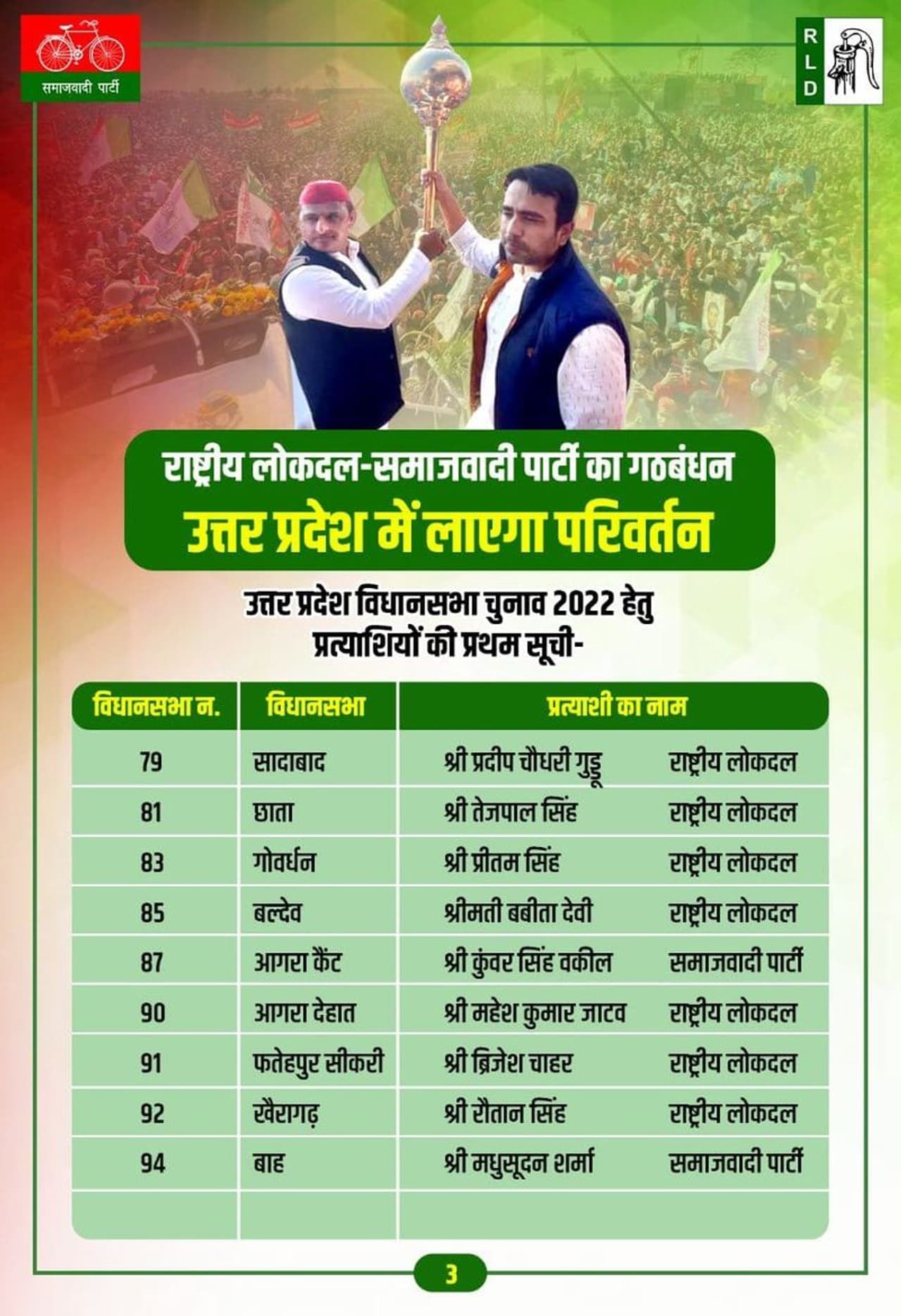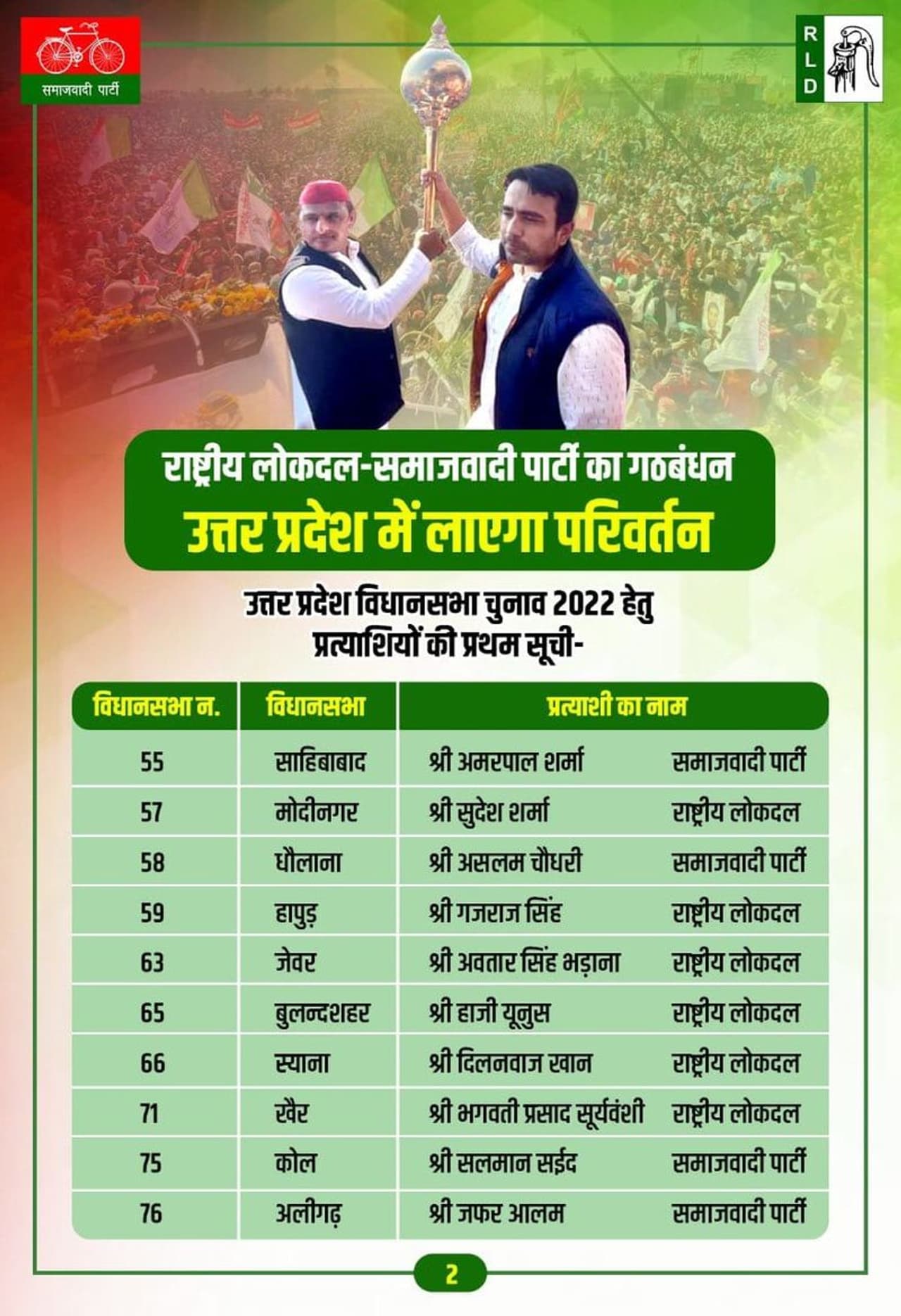 रालोद ने जो सूची जारी की है उसके अनुसार विधानसभा संख्या 8 कैराना से सपा के नाहिद हसन, विधानसभा संख्या 10 शामली से रालोद के प्रसन्न चौधरी, विधानसभा संख्या 12 चरथावल से सपा के पंकज मलिक, विधानसभा संख्या 13 पुरकाजी से रालोद के अनिल कुमार को टिकट दिया है। इसके साथ ही विधानसभा संख्या खतौली से रालोद के राजपाल सिंह सैनी, विधानसभा संख्या 21 नहटौर से रालोद के मुंशी राम, विधानसभा संख्या 46 किठौर से सपा के शाहिद मंजूर, विधानसभा संख्या 48 मेरठ से सपा के रफीक अंसारी, विधानसभा संख्या 52 बागपत से रालोद के अहमद हमीद, विधानसभा संख्या 53 लोनी से रालोद के मदन भैया को टिकट मिला है।
