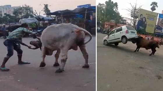 यूं ही नहीं कहते कि सूझबूझ के आगे ताकत भी फेल है। अगर दिमाग से काम लिया जाए, तो सामने कितना भी बड़ा पहलवान क्यों न हो, उसे पटकनी दी जा सकती है। हालांकि दोनों वीडियो किसी फिल्मी दृश्य से कम नहीं है। यहां सांड विलेन के किरदार में हैं। जैसा कि जाहिर है कि लगभग हर फिल्म में अगर विलेन है, तो वो क्लाइमेक्स तक सबको परेशान करके रखता है। यहां भी ऐसा ही है। पहले वीडियो में एक सांड और आदमी के बीच भिड़ंत हो गई। सांड आदमी को उठाकर पटकना चाहता था, लेकिन आदमी भी कम नहीं था। उसने सांड के सींग पकड़ लिया। सांड ने पूरी ताकत झोंकी, लेकिन अपने उद्देश्य में सफल नहीं हो सका। जैसे ही सांड का जोश कमजोर पड़ा, उस आदमी ने सांड को पटकनी दे दी। दूसरा वीडियो बिहार के वैशाली का है। यहां एक सांड को कार पर गुस्सा आ गया। उसने अपने सींग फंसाकर कार को हवा में लटका दिया। वो कार को पलटना चाहता था, लेकिन कुछ लोगों ने हिम्मत जुटाई और सांड को खदेड़ा।