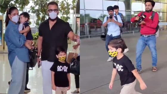 मुंबई. करीना कपूर (Kareena Kapoor) बुधवार सुबह-सुबह परिवार के साथ एयरपोर्ट पर नजर आई। वे फिल्म लालसिंह चड्ढा की शूटिंग पूरी कर एक बार फिर वेकेशन पर जा रही है। हालांकि, वे कहां जा रही है ये जानकारी सामने नहीं आई है। करीना पति सैफ अली खान (Saif Ali Khan), दोनों बेटे तैमूर (Taimur) और जेह (Jeh) के साथ नजर आ रही है। सामने आए वीडियो में देख जा सकता है कि जैसी ही कैमरामैन ने तैमूर की फोटोज क्लिक करने की कोशिश की, उनसे तुरंत दौड़ लगा दी। तैमूर इस दौरान काले रंग की टी-शर्ट और लाइट कलर की पैंट पहने नजर आया। उन्होंने चेहरे पर मास्क भी पहन रखा था। वहीं, ऐसा पहली बार देखने मिला कि करीना-सैफ की फैमिली एक ही फ्रेम में नजर आई।