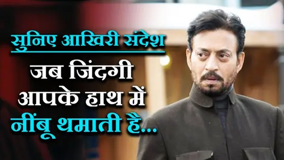 इरफान ने मैसेज जारी कहा था, हैलो भाइयों बहनों, नमस्कार मैं इरफान खान मैं आज आपके साथ हूं भी और नहीं भी। खैर ये ... लेकिन मेरे शरीर के भीतर कुछ अनचाहे मेहमान बैठे हुए हैं। उनसे वार्तालाप चल रहा है। देखते हैं किस करवट ऊंट बैठता है। जैसा भी होगा, आपको इतल्ला कर दी जाएगी। कहावत है कि व्हेन लाइफ गिव्ज यू लेमन, यू मेक ए लेमनेड। बोलने में अच्छा लगता है, लेकिन सच में जब जिंदगी आपके हाथ में नींबू थमाती है तो शिकंजी बनाना बहुत मुश्किल हो जाता है। लेकिन आपके पास और चॉइस भी क्या होती है पॉजिटिव रहने के अलावा।