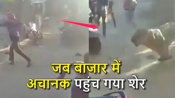 Video: बाजार में अचानक घुस आया शेर, मची अफरातफरी, जान बचाने इधर-उधर भागे लोग