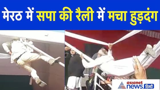 सपा की रैली में मचा हुड़दंग, मंच पर लगे टेंट के ऊपर चढ़ गए लोग