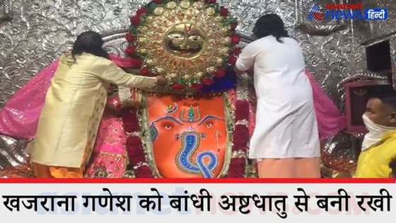 मध्य प्रदेश के इंदौर के विश्व प्रसिद्ध खजराना गणेश को इस बार रक्षाबंधन पर अष्टधातु की राखी बांधी गई। हर साल की तरह इस साल भी पालरेचा परिवार ने यह राखी तैयार की है। रखी खजराना गणेश के साथ ही बाबा महाकाल को समर्पित की जाएगी। इस साल भी राखी का विषय पौराणिक है। अष्ट धातु से बनी 40 इंच की राखी में हीरे, मोती के साथ कई रत्न जड़े हुए हैं। खजराना गणेश, महाकाल के साथ ही वीर बगीची, बड़ा गणपति सहित अन्य मंदिरों में चढ़ाई जाएगी। पुण्डरीक और शान्तु पालरेचा ने बताया कि यह पूरी तरह से अष्टधातु से बनी है और भगवान सूर्य नारायण की आकृति बनी है। देश में जो वैश्विक महामारी फैली है उसी को ध्यान में रखते हुए हमने भगवान सूर्य नारायण की राखी तैयार की है। इस राखी से देशभर में यह संदेश भी दिया जाएगा कि जिस प्रकार अंधेरा होने पर अगले दिन फिर उजाला होता है, ठीक उसी प्रकार देश और शहर से यह वैश्विक बीमारी भी खत्म होगी और देश एक बार फिर अपनी आर्थिक स्थिति में मजबूत होगा।