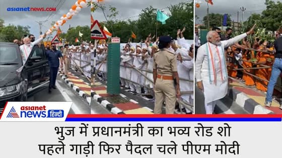 भुज में प्रधानमंत्री का भव्य रोड शो ,पहले गाड़ी फिर पैदल चले पीएम मोदी... देखें Video