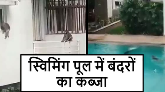 बंदरों ने एक सोसायटी के स्विमिंग पूल पर कब्जा कर लिया है और बड़े मजे के साथ घर की बालकनी से छलांग लगाकर पूल में नहा रहे हैं। तेज गर्मी में बंदरों के लिए पूल की यह सुविधा बहुत राहत लेकर आई है।