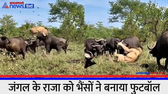 जंगली भैंसों और शेर में हमेशा ही जोरदार टक्कर देखने को मिलती है पर इस वायरल वीडियो में तो भैंसों ने शेर को फुटबॉल बना डाला।