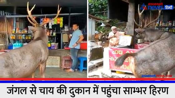 चाय की दुकान पर पहुंचे इस सांभर हिरण का वीडियो फॉरेस्ट अधिकारी सम्राट गौड़ा ने शेयर किया है।