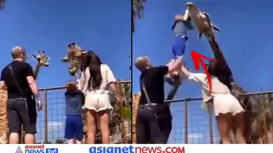 वीडियो डेस्क। जानवरों और इंसानों के बीच का प्रेम की कई वीडियो आपने देखे होंगे। ऐसा ही एक वीडियो सोशल मीडिया पर वायरल हो रहा है। वीडियो एक बच्चे और जिराफ का है। जहां एक बच्चा जिराफ को कुछ खिलाने की कोशिश करता लेकिन जिराफ बच्चे को मुंह से ऊपर खींच लेता है और हवा में टांग देता है। वहीं बच्चे के मां बाप बच्चे को पकड़ते हैं और नीचे उतारते। ये फनी वीडियो आपको भी खूब पसंद आएगा।