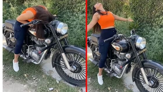 लड़की बुलेट की टंकी खोलकर पेट्रोल सूंघते हुए एक्शन करते हुए पीछे की ओर झुकती है लेकिन तभी बुलेट का बैलेंस बिगड़ जाता है। वीडियो में देखें आगे क्या हुआ...