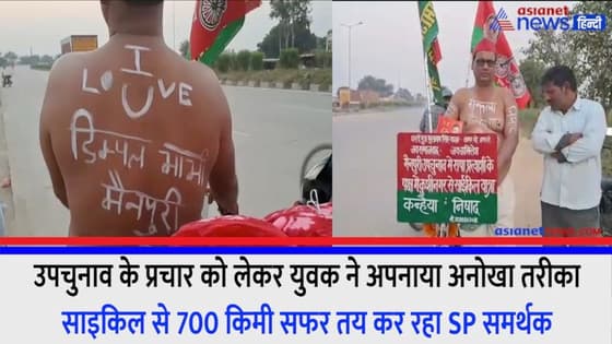 यूपी के जिले औरैया से होते हुए एक सपा समर्थक साइकिल से मैनपुरी उपचुनाव के प्रचार के लिए निकल पड़ा है। युवक अनोखा तरीका अपनाते हुए कुशीनगर से मैनपुरी की दूरी साइकिल से तय करेगा। उसने अपने शरीर में डिंपल यादव की जीत को लेकर लिखा है।