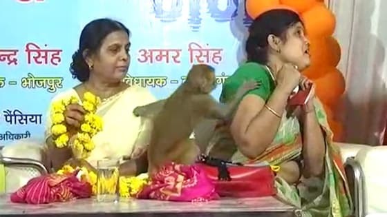 मंच पर छोटे बंदर का हंगामा, महिला के पीछे ही पड़ गया...देखें मजेदार वीडियो
