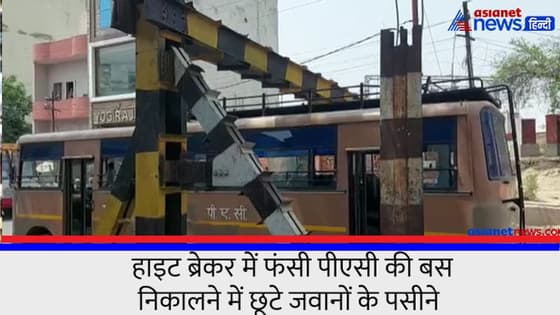 Video: हाइट ब्रेकर में फंसी पीएसी की बस, निकालने में छूटे जवानों के पसीने