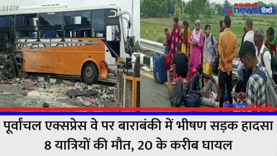 बाराबंकी: जिले में भीषण बस हादसा सामने आया है। यहां खड़ी स्लीपर बस में पीछे तेज रफ़्तार दूसरी यात्री बस ने जोरदार टक्कर मार दी। हादसे में 8 लोगों की मौके पर मौत हो गई भी करीब 35 बस यात्री गंभीर रूप से घायल हो गए। सूचना के बाद पहुंची पुलिस प्रशासन रेस्क्यू कर घायलों को इलाज के लिए अस्पताल भिजवाने कर कार्य शुरू किया। जानकारी के अनुसार लोनीकटरा थाना क्षेत्र के नरेंद्रपुर मदरहा गांव के निकट लखनऊ पूर्वांचल एक्सप्रेस वे पर बिहार से दिल्ली की ओर जा रही स्लीपर बस ने हाइवे किनारे खड़ी दूसरी बस में जोरदार टक्कर मार दी। सोमवार सुबह करीब साढ़े चार बजे तेज रफ्तार बस की टक्कर से खड़ी बस के परखच्चे उड़ गए, जिससे हादसे के बाद यात्रियों में चीख पुकार मच गई। घटना में महिला समेत 8 यात्रियों की मौके पर दर्दनाक मौत हो गई, वहीं करीब 20 यात्री घायल हो गए। सूचना पर मौके पर पहुंचे पुलिस और रेस्क्यू टीम ने राहत व बचाव कार्य शुरू किया और घायलों को अस्पताल भिजवाया।
